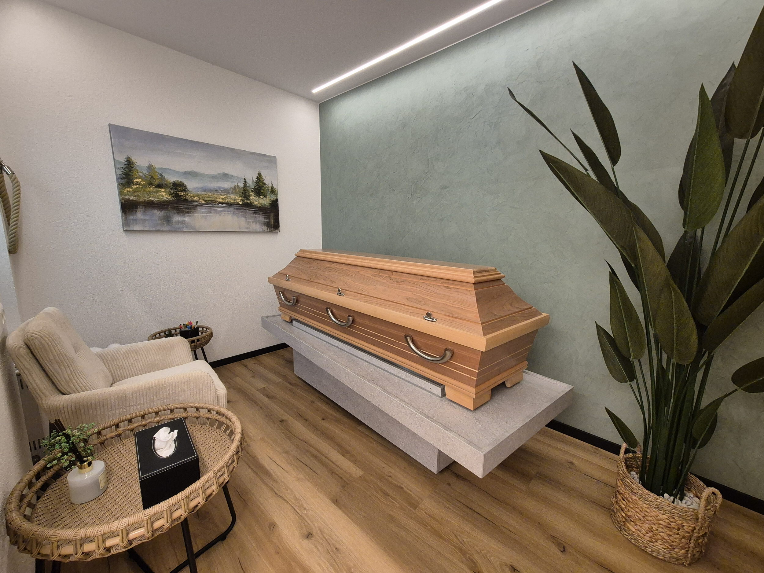 Beide Räume sind liebevoll gestaltet, mit ruhiger Hintergrundmusik, einem bequemen Sessel und Decke. Wer möchte, kann den Sarg bemalen – ein persönliches, bleibendes Zeichen.